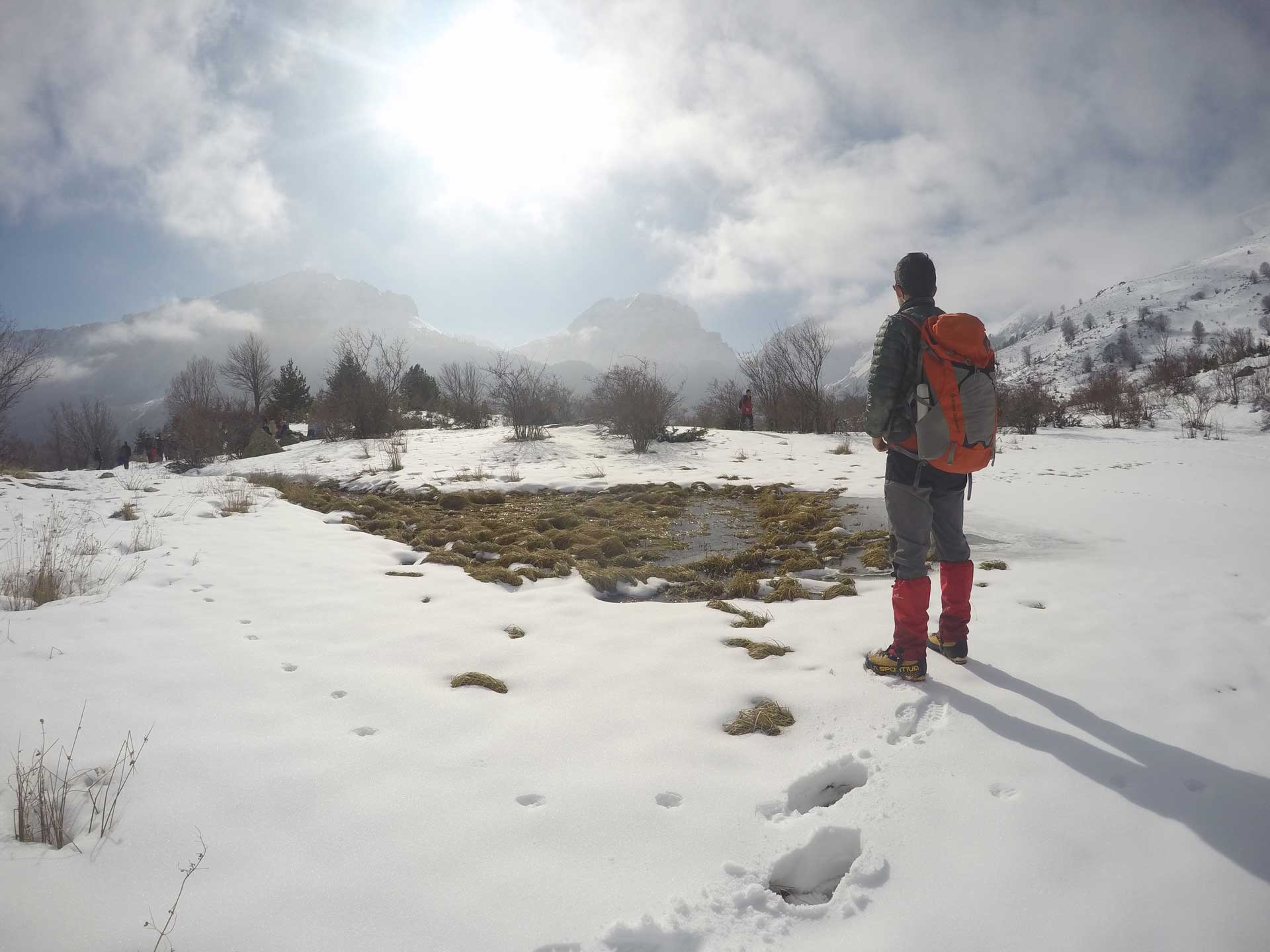 Backpack 30L, proper hiking shoes, warm jacket (soft shell), blouse, polyester t-shirt, long hiking pants, winter hat, wind gloves, walking stick, sunglasses, sunscreen.